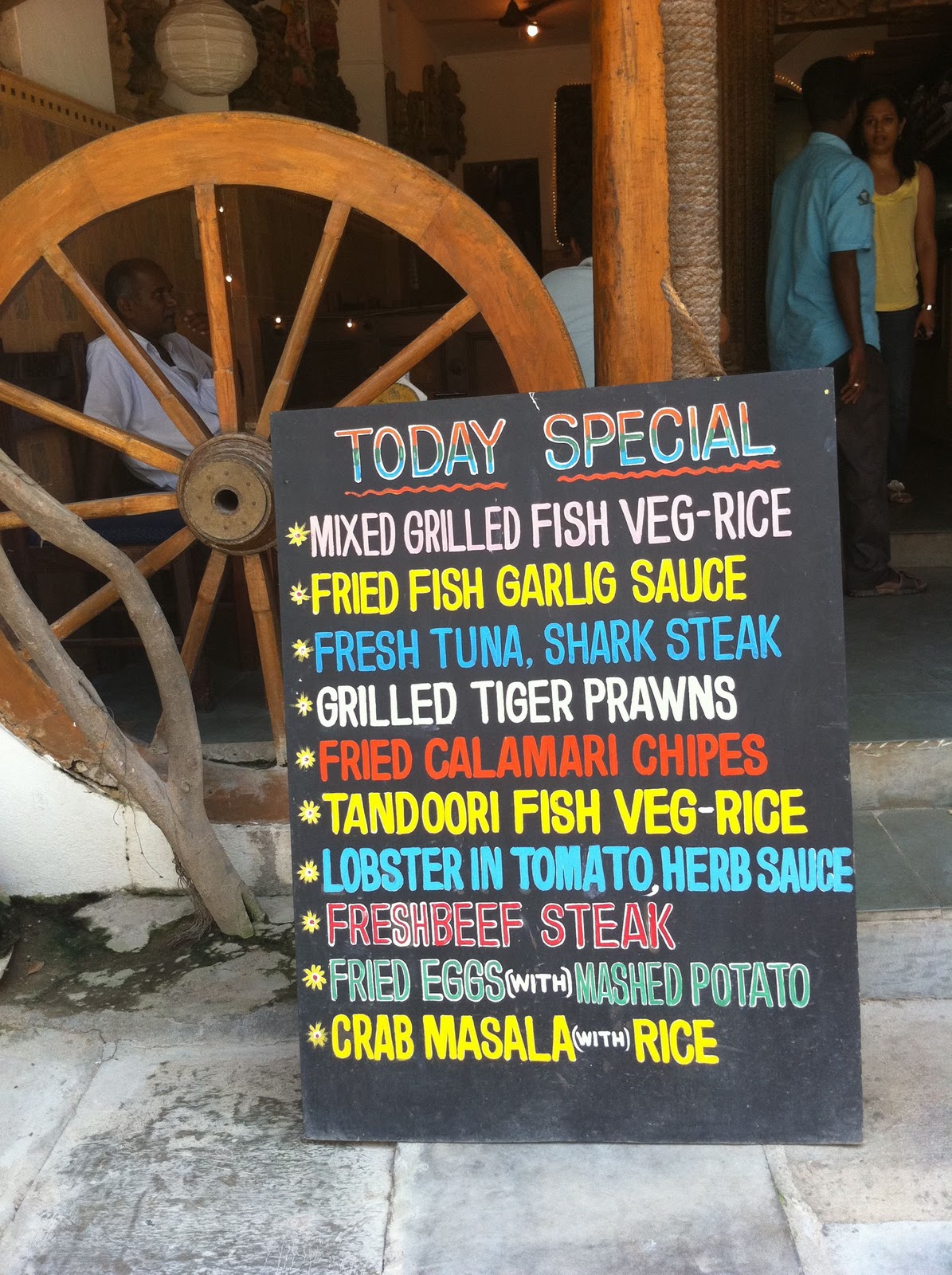 We reached her favorite restaurant in an hours time. Moonrakers- an extremely popular joint that still manages to be a well kept secret. Featured as a place 'to must-eat at' in the Lonely Planet, this is a traveler's haven. We were lucky to be there on a weekday afternoon as gets super crowded on the weekends. The place reminded me of Goan shacks. The friendly waiter in striking pink clothing got us the catch of the day. We selected a red snapper to be cooked with Chettinad masala. This particular red snapper was a deep sea catch and hence very fleshy. It was brought in early that very morning. The eyes were clear and there was no smell. My expert fish sensibilities were satisfied and I was ready to be wooed by Moonrakers. We also ordered a side of garlic, butter prawns. Oh yes. And masala calamari. As I think of this meal right now, my mouth waters and I would give anything to go back there again.